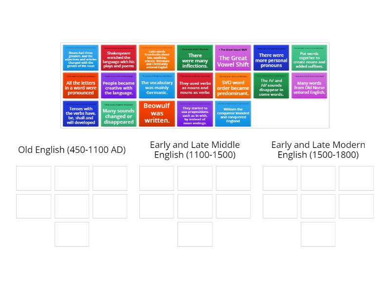Old English (450-1100 AD): There were many inflections., There were more personal pronouns, Nouns had three genders, and the adjectives and articles changed with the gender of the noun, All the letters in a word were pronounced, The vocabulary was mainly Germanic., Many words from Old Norse entered English., Beowulf was written. , Early and Late Middle English (1100-1500): William the conqueror invaded and conquered England, SVO word order became predominant., They started to use prepositions such as in with, by instead of noun endings., Latin words from books about law, medicine, science, literature and Christianity entered English, Many sounds changed or disappeared, Tenses with the verbs have, be, shall and will developed, Early and Late Modern English (1500-1800): They used verbs as nouns and nouns as verbs, Put words together to create nouns and added suffixes., Shakespeare enriched the language with his plays and poems, The Great Vowel Shift, The /t/ and /d/ sounds disappear in some words. , People became creative with the language.,