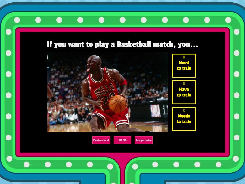 1) If you want to play a Basketball match, you... a) Need to train b) Have to train c) Needs to train 2) I want to go to the theater play a) I need to be quiet and listen b) I don't have to be quiet c) I don't need to do my homeworks 3) Tomorrow she has an exam a) She doesn't need to study b) She has to eat burgers c) She needs to study 4) To drive... a) They need to go to Burger King b) You don't have to get your driver's license c) You need to get your driver's license 5) To go to Port Aventura... a) I need to buy a ticket b) I need to buy a chicken c) I don't have to buy a ticket 6) If you want to read a book, you don't have to... a) Play attention b) Draw a picture between the pages c) Touch the pages 7) If you have a dog... a) You don't have to hurt it b) You need to hurt it c) You don't need to pick up the poop 8) If I want to adopt a fish... a) I need to go to the zoo b) I need to go to the restaurant c) I need to go to the pet shop 9) To play a Padel match... a) We need to hug each other b) We don't have to know how to play Padel c) We have to be 4 people to play 10) If you want to write a book... a) You need a pencil and a rubber b) You need spaghetti c) You don't have to write