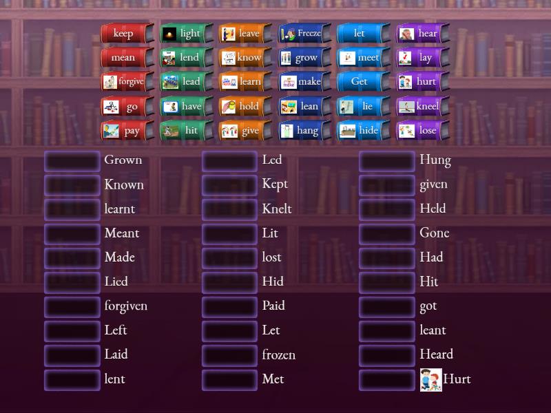 forgive - forgiven, Freeze - frozen, Get - got, give - given, go - Gone, grow - Grown , hang - Hung, have - Had, hit - Hit, hide - Hid, hear - Heard, hold - Held, hurt - Hurt, keep - Kept, kneel - Knelt, know - Known , lay - Laid, lead - Led, lean - leant, learn - learnt, leave - Left, lend - lent, let - Let, lie - Lied, light - Lit, lose - lost, make - Made, meet - Met, mean - Meant, pay - Paid,
