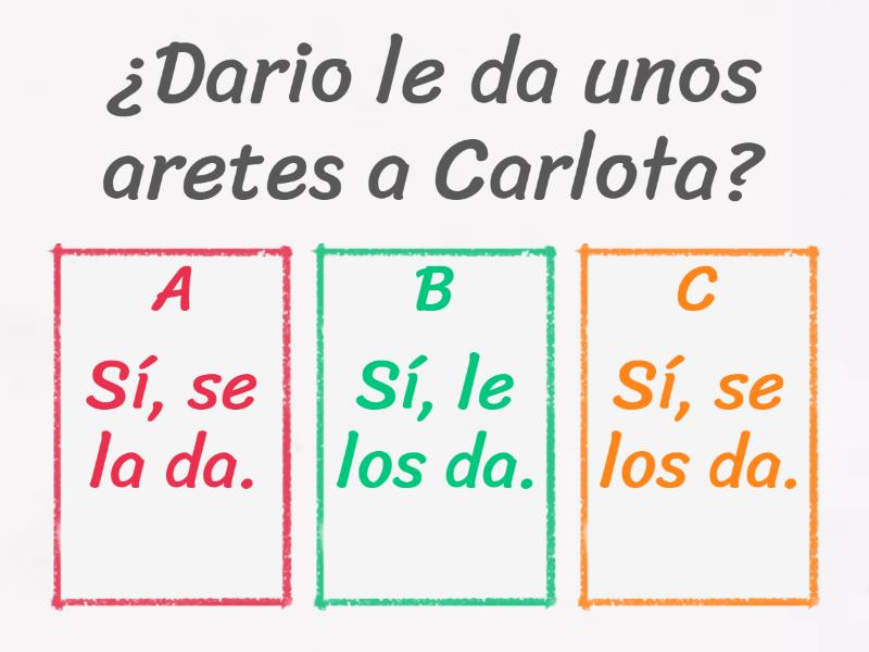 1) ¿Dario le da unos aretes a Carlota? a) Sí, se la da. b) Sí, le los da. c) Sí, se los da. 2) ¿La profe nos enseña los pronombres? a) Sí, nos los enseña b) Sí, se lo enseña c) Sí, nos lo enseña 3) ¿Vas a darme un recibo de mi compra? a) Sí, te voy lo a dar b) Sí, te lo voy a dar c) Sí, te voy a darlo 4) ¿Están pidiéndoles dinero a sus tías? a) Sí, están pidiéndolose b) Sí, se están lo pidiendo c) Sí, están pidiéndoselo 5) ¿Alberto le dice mentiras a su jefe? a) Sí, le las dice b) Sí, se las dice c) Sí, dice le las 6) ¿Nos sirves otro vino? a) Sí, nos lo sirvo b) Sí, lo nos sirvo c) Sí, sírvonoslo 7) ¿Quieres prestarme un lápiz? a) Sí, te lo quiero b) Sí, te lo quiero prestar c) Sí, me lo quieres prestar 8) ¿Me pasas esas sandalias? a) Sí, me las pasas b) Sí, te las paso c) Sí, te paso las 9) ¿Les quieren dar un abrazo? a) Sí, se lo queremos dar b) Sí, se los queremos dar c) Sí, queremos les darlo 10) ¿Tú le regalas ese carro? a) Sí, le lo regalo b) Sí, se lo regalas c) Sí, se lo regalo