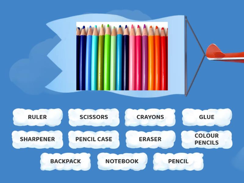 COLOUR PENCILS, GLUE, BACKPACK, SCISSORS, NOTEBOOK, PENCIL, SHARPENER, ERASER, CRAYONS, PENCIL CASE, RULER,