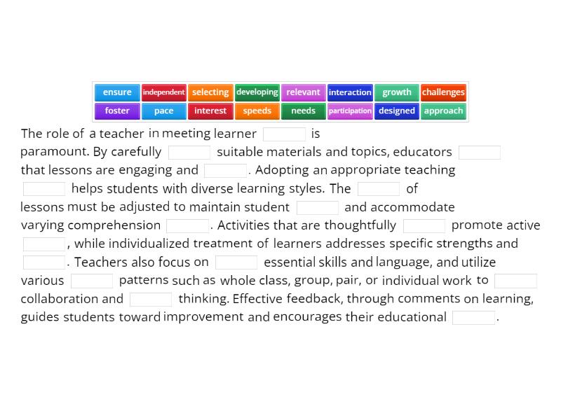 The role of a teacher in meeting learner ____ is paramount. By carefully ____ suitable materials and topics, educators ____ that lessons are engaging and ____. Adopting an appropriate teaching ____ helps students with diverse learning styles. The ____ of lessons must be adjusted to maintain student ____ and accommodate varying comprehension ____. Activities that are thoughtfully ____ promote active ____, while individualized treatment of learners addresses specific strengths and ____. Teachers also focus on ____ essential skills and language, and utilize various ____ patterns such as whole class, group, pair, or individual work to ____ collaboration and ____ thinking. Effective feedback, through comments on learning, guides students toward improvement and encourages their educational ____.