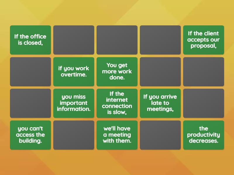If you arrive late to meetings, - you miss important information., If the office is closed, - you can't access the building., You get more work done. - if you work overtime., If the client accepts our proposal, - we'll have a meeting with them., If the internet connection is slow, - the productivity decreases., The team will be pleased - if the project is successful., They will probably agree to the deal - if you present your idea clearly., If you attend all the training sessions, - you will improve your skills., You receive more positive feedback - if you provide good customer service., If we reduce costs, - we will increase our profit.,