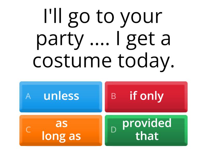 1) I'll go to your party .... I get a costume today. a) unless b) if only c) as long as d) provided that 2) ..... I could stay here! But I have to go back home now. a) Unless b) I wish c) As long as d) if 3) ...... Adam starts training regularly, he will never win the championship. a) As long as b) Provided that c) Unless d) I wish 4) There is no bread for the burgers! If only I ...... some, earlier this morning. a) buy b) would buy c) bought d) had bought 5) I wish Sarah ...... come visit little Jimmy, but she lives in Rome now. a) had b) won't c) could d) can 6) ...... we could get similar jobs there and a good school for Ronnie, we would seriously consider moving. a) I wish b) If only c) if d) As long as 7) The company will accept the offer ...... they get 50% of the profits. a) unless b) if only c) on condition that d) they wish 8) There will be a climate crisis ..... companies reduce their CO2 emissions. a) as long as b) provided that c) unless d) if only 9) I wish there ....... cellphones when I was a kid. a) are b) were c) could be d) had been 10) If only my boss ....... me less work to do! I can't deal with all this! a) could give b) would give c) gives d) giving 11) I wish Liam ....... less time playing videogames! It's not healthy! a) spends b) spent c) had spent d) could spend 12) I would catch up with all the studying I have to do, if only I .......... time. a) stop b) stopped c) had stopped d) could stop 13) If too many species become extinct, habitats ........ a) collapsed b) would collapse c) would have collapsed d) collapse 14) If you drop that ice cream, I ....... you another one. a) don't buy b) will not buy c) would not buy d) wouldn't have bought 15) If a dog could speak, its owners ......... it to TV shows instantly! a) took b) take c) would take d) takes 16) If Buenos Aires .......... a beach and a nice sea, fewer people would travel to Mar del Plata. a) have b) will have c) had d) had had 17) I ......... Tiffany a present if you had told me earlier! a) buy b) will buy c) would buy d) would have bought 18) If Argentina .... Germany in 2014, Maradona would have seen Messi lift the cup. a) beat b) will beat c) would beat d) had beaten 19) If I dyed my hair white, I ...... like a football player. a) look b) will look c) would look d) would have looked 20) If we ..... the 20:07 bus, we will not be at the cinema on time. a) miss b) missed c) had missed d) would miss 21) If dogs .... their tail, it means that they are happy. a) wag b) wagged c) had wagged d) would wag 22) If you study a lot, you ...... the test! a) pass b) will pass c) would pass d) had passed