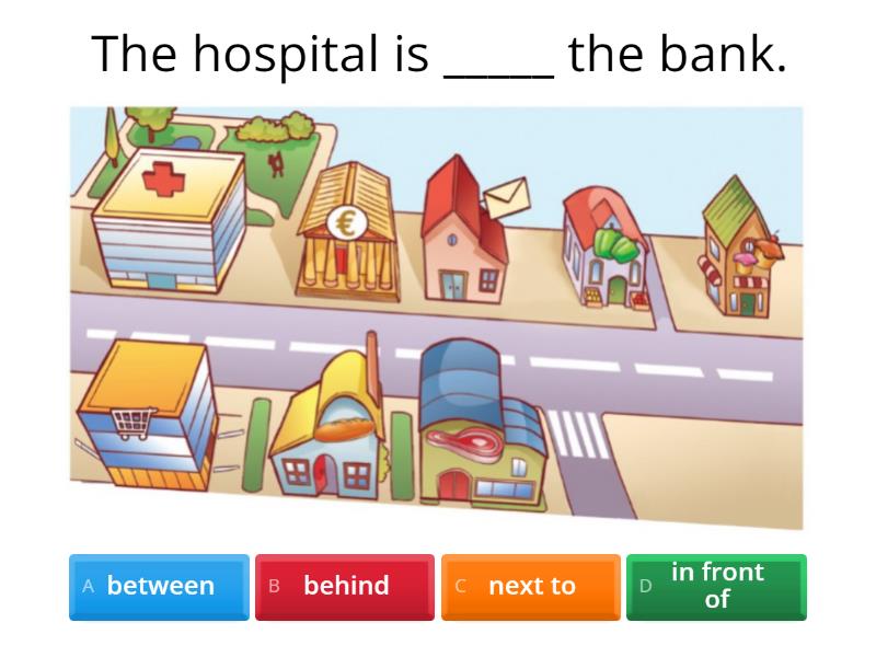 1) The hospital is _____ the bank. a) between b) behind c) next to d) in front of 2) The post office is _____ the butcher's. a) behind b) across c) between d) next to 3) The bank is _____ the hospital and the post office. a) next to b) in front of c) behind d) between 4) The supermarket is _____ the hospital. a) across b) behind c) next to d) between 5) The baker's is _____ the butcher's and the supermarket. a) in front of b) between c) behind d) next to 6) The park is _____ the hospital. a) next to b) between c) in front of d) behind 7) The greengrocer's is _____ the post office. a) between b) in front of c) behind d) next to 8) The sweet shop is _____ the greengrocer's. a) next to b) in front of c) between d) behind