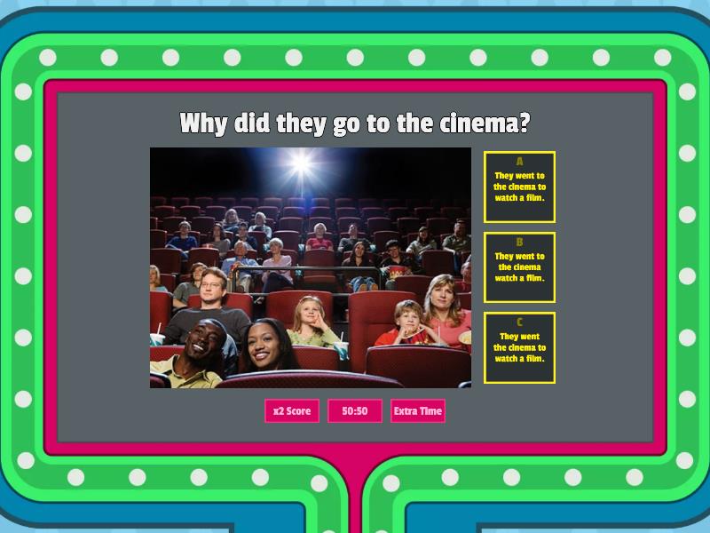 1) Why did they go to the cinema? a) They went to the cinema to watch a film. b) They went to the cinema watch a film. c) They went the cinema to watch a film. 2) Why did they go to school? a) They went to school to watch aquatic animals. b) They went to school to study. c) They went to school study. 3) Why did they go to the art gallery? a) They went to the art gallery study art. b) They went to the art gallery to study art. c) They went to the art gallery to watch films. 4) Why did they go to the café? a) They went to the café have breakfast. b) They went to the café to have breakfast. c) They went the café to have breakfast. 5) Why did they go to the theme park? a) They went to the theme park to spend time with their family.  b) They went the theme park to spend time with their family. c) They went to the theme park spend time with their family.  6) Why did they go to the museum? a) They went to the museum to play football. b) They went to the museum to watch the animals.  c) They went to the museum to study history.