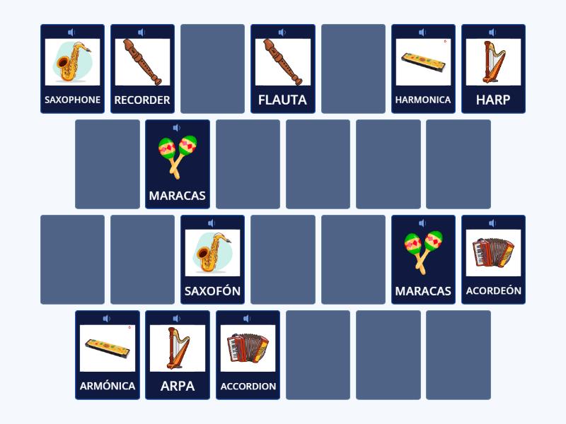 MARACAS - MARACAS, SAXOPHONE - SAXOFÓN, HARMONICA - ARMÓNICA, ACCORDION - ACORDEÓN, HARP - ARPA, RECORDER - FLAUTA, DRUM - TAMBOR, VIOLIN - VIOLÍN, CASTANETS - CASTAÑUELAS, PIANO - PIANO, GUITAR - GUITARRA, TRUMPET - TROMPETA, TAMBOURINE - PANDERETA,