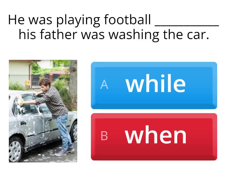 1) He was playing football ___________ his father was washing the car. a) while b) when 2) They were doing a pic nic in the park ______ the rain started! a) while b) when 3) I _____________ while my mother _________________ the dinner. a) was studying / cooked b) studied / cooked c) was studying / was cooking 4) I _________ a horror movie when my brother _________ me. a) was watching / scared b) was watching / was scaring c) watched / scared 5) I was walking my dog _______ a cat appeared. a) when b) while 6) She was sleeping ________ the phone rang. a) while b) when 7) I ____________ attention while the teacher_____________. a) wasn't paying / spoke b) wasn't paying / was speaking c) payed / spoke 8) I was doing my homework ______ my dog barked loudly. a) while b) when 9) He ______________ tennis while we _____________ hockey. a) was playing / played b) played / played c) was playing / were playing 10) I ________ TV when the lights ________ out. a) watched / went b) was watching / were going c) was watching / went