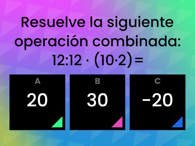 1) Resuelve la siguiente operación combinada: 12:12 · (10·2)=  a) 20 b) 30 c) -20 2) Resuelve la siguiente operación combinada: 25:5 + 10 · 4 = a) -44 b) 45 c) -54 3) Resuelve la siguiente operación combinada: 500 : 5 + 25 · 6 =  a) 250 b) -250 c) 25 4) Resuelve la siguiente operación combinada: (45+5) : (13 -3) =  a) 5 b) -5 c) 16 5) Resuelve la siguiente operación combinada: 3 · ( 6+2 -5) - 12 : 6 =  a) -7 b) 17 c) 7 6) El orden correcto en la jerarquización de las operaciones es: a) adición, sustración, paréntesis, potencias, multiplicación y división. b) paréntesis, potencias y raices, multiplicación y división y adición y sustracción. c) parentesis, multiplicación y división, potencias y raíces, sustracción y adición. 7) En la siguiente operación combinada 100 + 24 + 35 : 2 = que debo realizar primero a) división y luego la adición  b) adición de izquierda a derecha