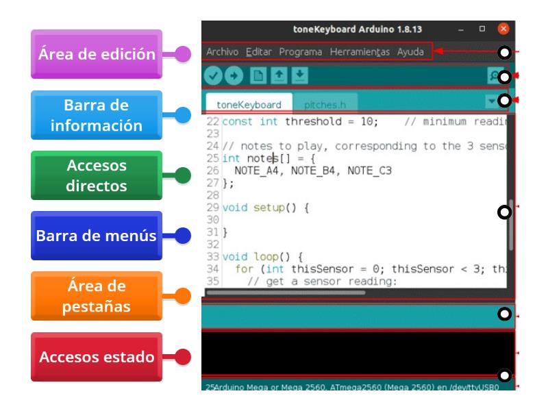 Barra de información, Accesos estado, Área de pestañas, Accesos directos, Área de edición, Barra de menús.