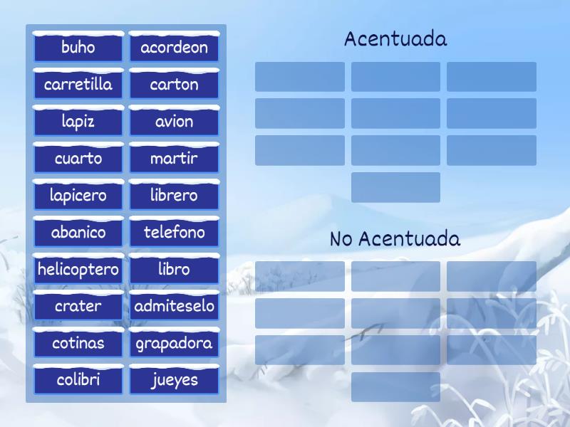 Acentuada: lapiz, colibri, telefono, martir, acordeon, helicoptero, admiteselo, carton, crater, avion, No Acentuada: abanico, libro, cuarto, grapadora, buho, carretilla, jueyes, librero, lapicero, cotinas,