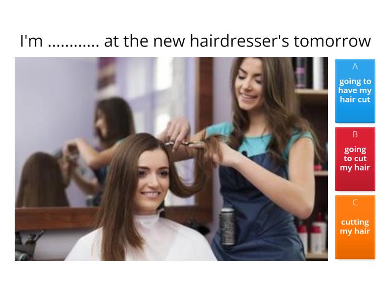 1) I'm ............ at the new hairdresser's tomorrow a) going to have my hair cut b) going to cut my hair c) cutting my hair 2) She needs to ......... It doesn´t work properly a) have her car repair b) have her car repaired c) repair her car 3) I must ....... the central heating ...... I will call the service. a) have/ fixed b) have/ fix c) fix/had 4) They ought to .......the broken windows ....... a) have/replaced b) have/replace c) replace 5)  I .......... my phone ........ yesterday. a) have/ repaired b) had/repaired   c) repaired 6)  She didn't have time to get to the shops and ....... a) have her purchase change b) have her purchase changed 7) I have just .... my car ....by the mechanic. a) have/serviced b) had/serviced 8) I usually .....my car .....at the weekend. a) had/washed b) have/washed c) have/wash 9) She ......... on the underground last week. a) had her purse stole b) had her purse stolen c) got her purse stolen 10) He ..........movie tickets ..... to his home address yesterday a) has/ taken b) had/taken c) have/taken 11) You should .........! You can´t have all your clothes dirty for so long! a) have the washing machine fixed b) had the washing machine fixed c) have the washing machine fix 12) We ......the washing up .....by the maid everyday. a) have/done b) had/ done 13) I .....my driving license and passport .....while I was at the airport last Monday. a) had/stolen b) have/stolen c) get/stolen 14) I ......... the house ..... if I could afford it. a) would have/redecorated b) would have had/redecorated 15) You should .....your suit.....for the wedding next weekend. a) have/clean b) have/cleaned c) had/cleaned 16) I am going to .....my hair .... tomorrow at the hairdresser´s. a) have/dyed b) had/dyed c) get/dye 17) He ....... his bags ..... onto the train by a porter a few minutes ago. a) had/loaded b) get/load 18) I ..... my car ......... three months ago. a) have/ service b) had/ serviced c) will have/ serviced 19)  I'm going to ___ my bike ____tomorrow.  a) have/ fix b) have/ fixed