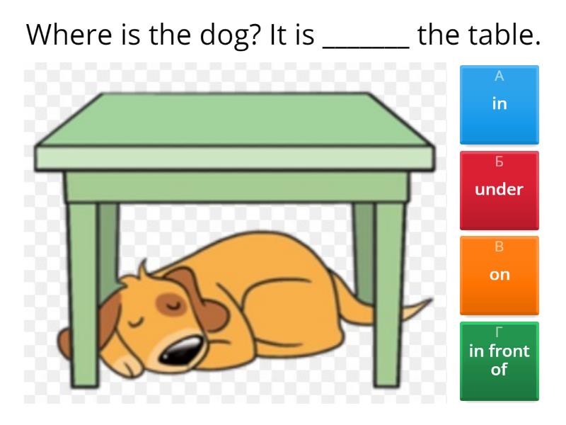 1) Where is the dog? It is _______ the table. a) in  b) under c) on d) in front of 2) Where is the cat? It is ________ the table. a) on b) in c) next to d) under 3) Where is the dog? It is _______ the tree. a) on b) under c) behind d) next to 4) Where is the cat? It is ________ the box. a) behind b) in front of c) on d) in 5) Where is the cat? It is ______ the tree. a) under b) in front of c) next to d) behind 6) Where is the robot? The robot is _______the box. a) on b) in c) under d) behind 7) Where is the rabbit? It is _______ the door. a) behind b) in c) next to d) on 8) Where is the boy? He is _______ the house. a) in b) behind c) in front of d) next to 9) Where are the keys? They are _______ the table. a) in b) under c) behind d) on 10) Where is the teddy bear? It is _______ the baby. a) in b) next to c) behind d) under 11) Where is the hairbrush? It is _______ the candle. a) in front of b) behind c) next to d) above