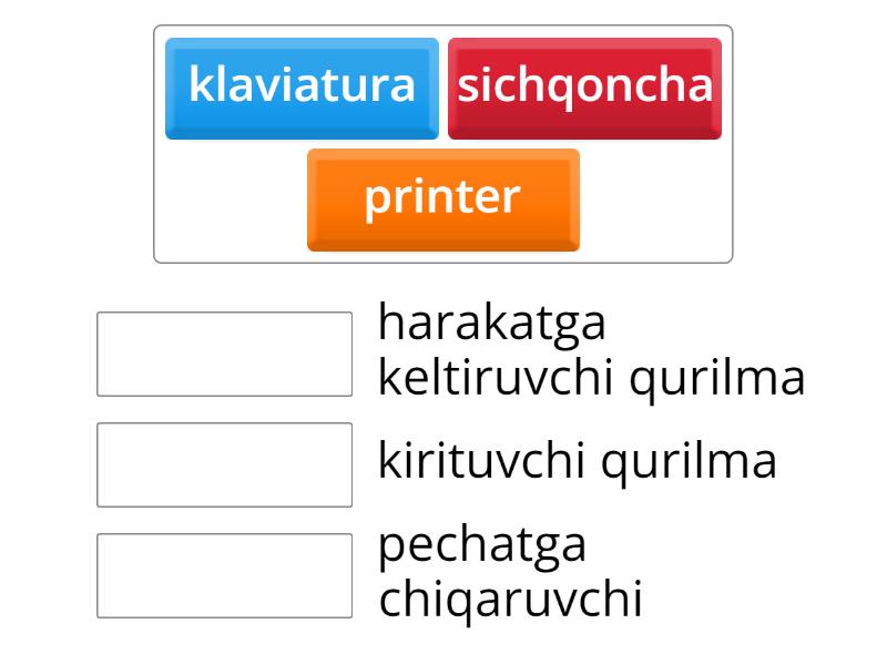 klaviatura - kirituvchi qurilma, printer - pechatga chiqaruvchi, sichqoncha - harakatga keltiruvchi qurilma,