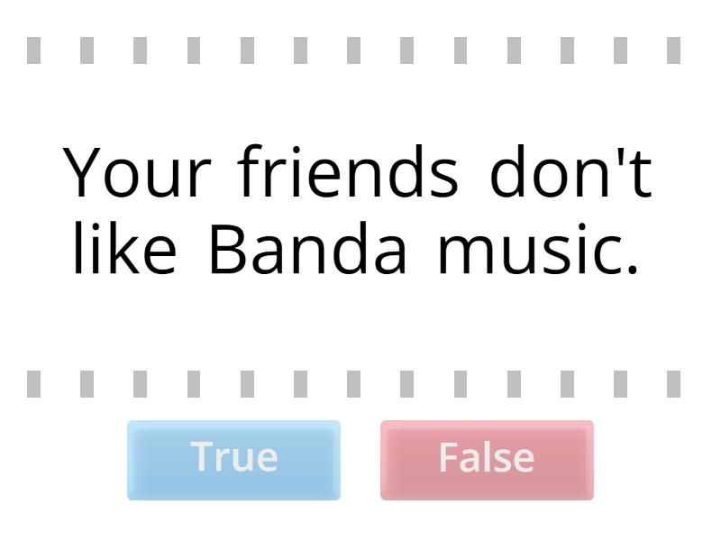 True:  Your friends don't like Banda music., My favorite teacher gives too much homework., Does your mom visit you here?, Do your fellas play Minecraft?, My bestie studies in a different campus., Messi doesn't play in the BArcelona´s team anymore, False: Teachers works too much for a low payment, My parents doesn't like pets at home., I works from Monday to Friday., Do teacher Sam rest on weekends?, Teacher Cedillo don't drink coffee in the mornings., Does your classmates get punctually to class?,