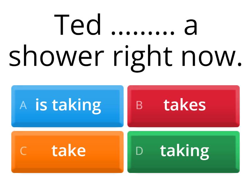 1) Ted ......... a shower right now. a) is taking b) takes c) take d) taking 2) What ..... we ....... for dinner tonight? a) is/having b) do/have c) are/having d) has 3) My brother ...... a daughter and a son. a) is having b) has c) are having d) have 4) I ........... some math problems at the moment. a) don't solve b) doesn't solve c) solving d) am not solving 5) My grandfather often ......... over for dinner at the weekends a) come b) comes c) is coming d) are coming 6) My school ......... at nine every day. a) starts b) start c) is starting  d) are starting 7) What time ...... you ...... on weekdays? a) do/wake up b) is/waking up c) are/waking up d) does /wake up 8) I usually ......... on Sundays but today I ...... a) am working/don't work b) working/am working c) don't work/am working d) works/am working
