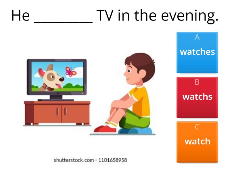 1) He _________ TV in the evening.  a) watches b) watchs c) watch 2) She ________ many comics. She loves reading.  a) reades b) reads c) read 3) ________ you play video games in the morning? No, I don't.  a) Don't b) Does c) Do 4) They _______ skateboard on Monday. They skateboard at the weekend. a) Don't b) Do c) Doesn't 5) She _______ ___ very early. a) wakes ups b) wake up c) wakes up 6) They _______ in the park every afternoon.  a) does exercise b) do exercise c) does exercises 7) In the morning I __________ a) have breakfast b) has breakfast 8) At night He_____ a) go to bed b) goes to bed c) goes bed 9) _____ she go to school? a) Does b) Do c) Doeses 10) At school we____ a) study b) studies c) does study