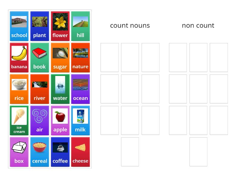 count nouns: banana, apple, flower, ocean, hill, school, river, box, plant, book, non count: milk, water, rice, coffee, ice cream, cheese, air, nature, cereal, sugar,