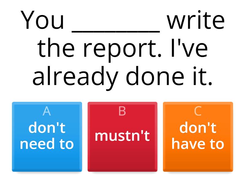 1) You ________ write the report. I've already done it. a) don't need to b) mustn't c) don't have to 2) You _______ smoke here. It's against the rules! a) don't have to b) shouldn't c) mustn't 3) Tom is lucky. He ________ get up early on Monday mornings because he starts working at 10 a.m a) doesn't need to b) mustn't c) don't have to 4) When you go to school you ________ wear a uniform. a) must b) don't need to c) have to 5) You ________ park here. It's an emergency exit. a) don't have to b) not have to c) mustn't 6) While in hospital waiting rooms you ___________speak in a low voice. a) has to b) should c) must 7) We _____________ buy groceries; the fridge is empty. a) need to b) have to c) must 8) She ___________ practice more if she wants to improve her English a) needs to b) has to c) must 9) Bayron _______________ learn english to study in italy. a) has to b) doesn't need to c) must