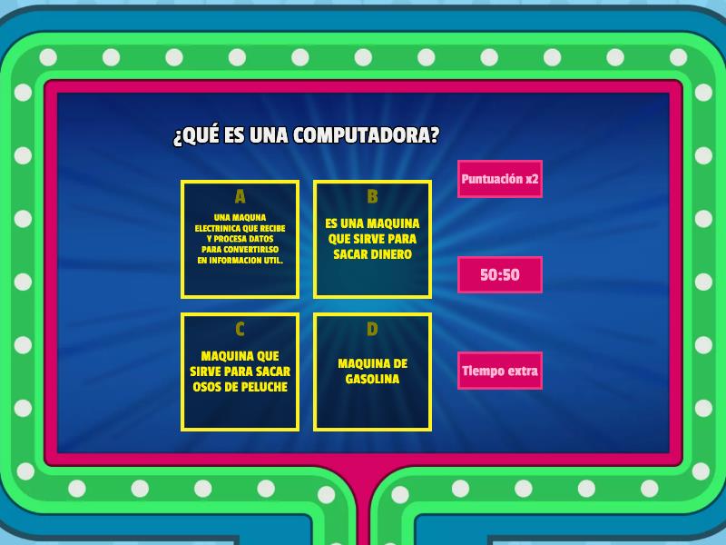 1) ¿QUÉ ES UNA COMPUTADORA? a) UNA MAQUNA ELECTRINICA QUE RECIBE Y PROCESA DATOS PARA CONVERTIRLSO EN INFORMACION UTIL. b) ES UNA MAQUINA QUE SIRVE PARA SACAR DINERO c) MAQUINA QUE SIRVE PARA SACAR OSOS DE PELUCHE d) MAQUINA DE GASOLINA 2) ¿CUAL ES LA FUNCION DE LA PANTALLA O MONITOR DE UNA COMPUTADORA? a) ES LA PANTALLA QUE PERMITE COLOCAR NUEMROS PARA LA REALIZACION DE UNA OPERACION b) PERMITE VER LA INFORMACION QUE SE INGRESA A LA COMPUTADORA, ASI COMO CONOCER LA INFORMACION QUE SE OBTIENE EN IMAGEN O VIDEO. c) ES UN MONITOR QUE PERMITE MEDIR LA PRESION ARTERIAL d) PANTALLA QUE PEMITE MONITOREAS LAS HONDAS SISMICAS 3) ¿CUAL ES LA FUNCION DEL CPU? a) ES UN DVD QUE REPRODUCE VIDEOS b) ES UN ACONSOLA DE JUEGOS c) ES UN DISCO DVD d) ES LA UNIDAD CENTRAL DEL PROCESO DONDE SE GUARDA TODA LA INFORMACION e) ES UNA MAQUINA QUE PRODUCE BILLETES f) DISCO ACETATO 4) ¿CUALES SON LAS FUNCIONES DEL TECLADO? a) SIRVE PARA REPRODECIR MUSICA b) ES UN PERIFERICO QUE CONSISTE EN UN SISTEMA DE TECLAS QUE PERMITE INTRODUCIR DATOS ESCRITOS O NUMERICOS EN UN ORDENADOR c) SIRVE PARA REALIZAR OPERACIONES BASICA d) SIRVE PARA CAPTURAR DIJITOS PARA RETIRAR DINERO 5) ¿CUALES SON LAS FUNCIONES DEL MOUSE O RATON? a) DISPOSITIVO QUE SE MANEJA CON UNA SOLA MANO Y PERMITE DIRIGIR EL MOVIMIENTO DEL PUNTERO SOBRE LA PANTALLA PARA TRASMITIR ORDENES DIVERSAS. b) ANIMAL ROEDOR c) PERSONAJE QUE DA DIVERSION d) INTRUMENTO SIRVE PARA PASAR ENERGIA e) APARTO QUE SIRVE PARA TRASMITIR RUIDO f) APARO QUE SIRVE PARA PROYECAR IMAGEN 6) ¿CUAL ES LA FUNCION DE LOS PARLANTES O BOCINAS? a) REPRODUCTOR DE MUSICA b) SIRVE PARA ESCUCHAR MUSICA O CULAQUIER SONIDO QUE PUEDA LLEGAR A PRODUCIR c) OBJETO QUE REPRODUCE SONIDO EN LA IGLESIA d) OBJETO QUE PROVIENE DEL MAR Y REPRODUCE SONIDO