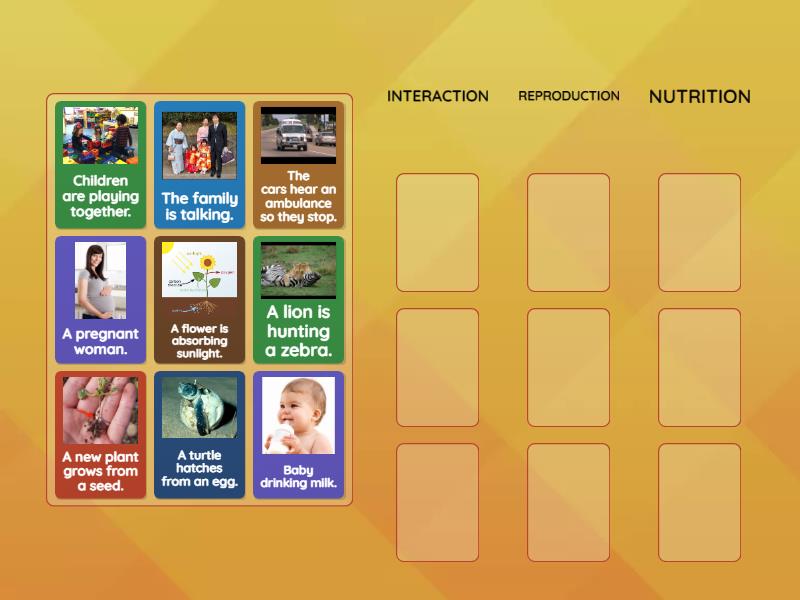 INTERACTION: The cars hear an ambulance so they stop., Children are playing together., The family is talking., REPRODUCTION: A new plant grows from a seed., A turtle hatches from an egg., A pregnant woman., NUTRITION: Baby drinking milk., A flower is absorbing sunlight., A lion is hunting a zebra.,