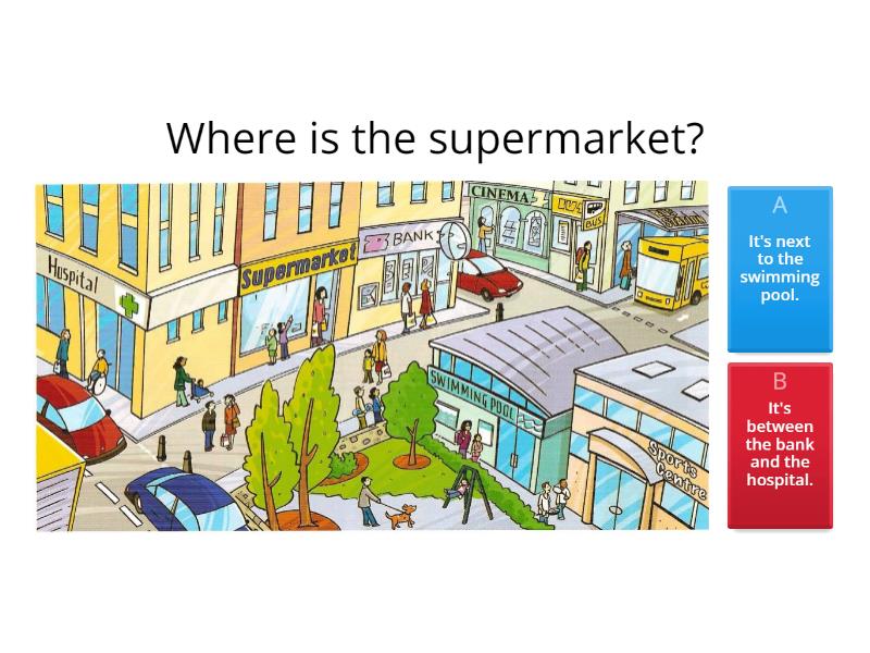1) Where is the supermarket? a) It's next to the swimming pool. b) It's between the bank and the hospital. 2) Where is the sports centre? a) It's next to the swimming pool. b) It's in front of the supermarket. 3) Where is the bank? a) It´s in front of the swimming pool. b) It's between the supermarket and the hospital. 4) Where is the cinema? a) It's behind the bank. b) It's between the bank. 5) The park is ______________________ the bank. a) in front of b) behind c) between 6) Where is the park? a) It's behind the bus station. b) It's in front of the sports center. 7) Where is the hospital? a) It's next to the supermarket. b) It's opposite the bus station.  8) The theatre is ______________________ the supermarket and the stadium. a) between b) behind c) in front of 9) The hospital is ____________________ the museum. a) opposite b) between c) behind 10) The school is _______________________ the museum. a) behind b) in front of c) next to