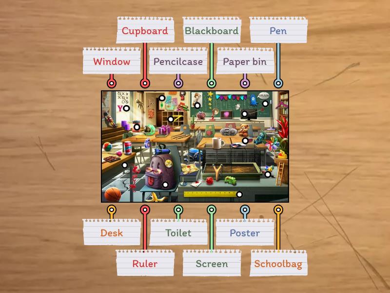 Screen, Cupboard, Desk, Poster, Paper bin, Blackboard, Window, Schoolbag, Pen, Pencilcase, Toilet, Ruler.