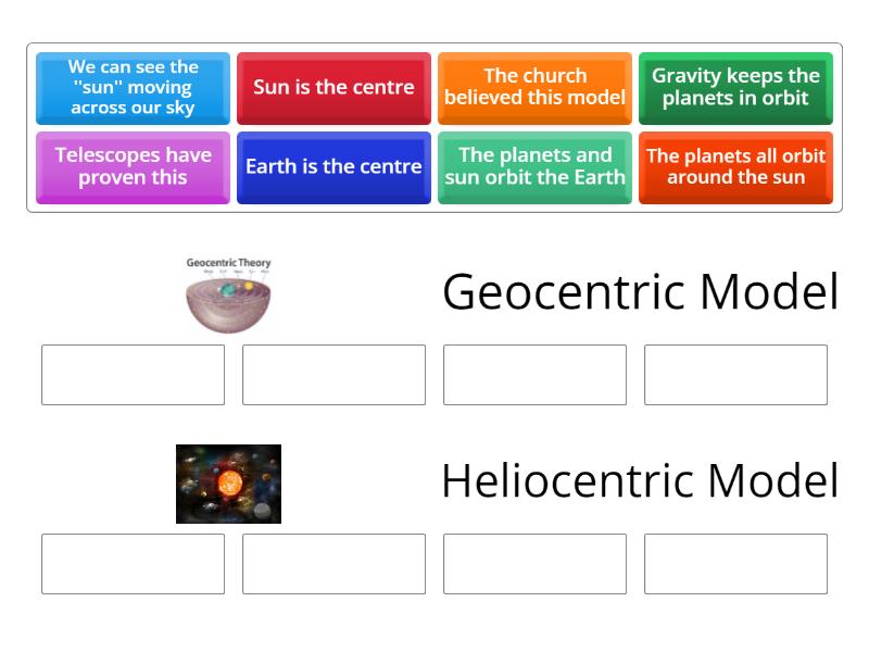 Geocentric Model: Earth is the centre, The planets and sun orbit the Earth, We can see the ''sun'' moving across our sky, The church believed this model, Heliocentric Model: Sun is the centre, The planets all orbit around the sun, Gravity keeps the planets in orbit, Telescopes have proven this,