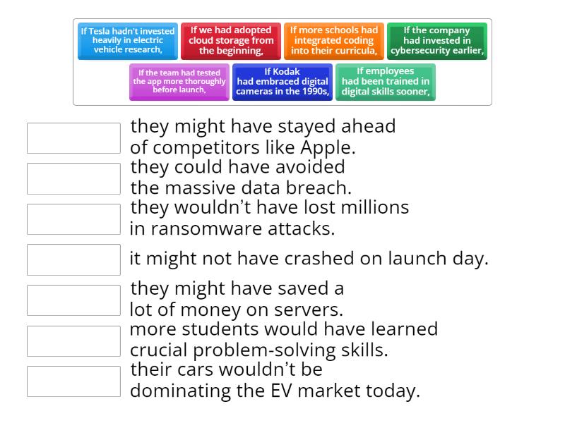 If the company had invested in cybersecurity earlier, - they wouldn’t have lost millions in ransomware attacks., If Kodak had embraced digital cameras in the 1990s, - they might have stayed ahead of competitors like Apple., If employees had been trained in digital skills sooner, - they could have avoided the massive data breach., If more schools had integrated coding into their curricula, - more students would have learned crucial problem-solving skills., If Tesla hadn’t invested heavily in electric vehicle research, - their cars wouldn’t be dominating the EV market today., If we had adopted cloud storage from the beginning, - they might have saved a lot of money on servers., If the team had tested the app more thoroughly before launch, - it might not have crashed on launch day.,