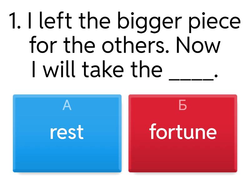 1) 1. I left the bigger piece for the others. Now I will take the ____. a) rest b) fortune 2) 2. She used a polite ____ to explain her opinion. a) expression b) fate 3) 3. We need to ____ the chairs before the party starts. a) arrange b) amuse 4) 4. He saw the train coming and started to ____ the stairs. a) hurry down b) pile 5) 5. There was a big ____ of books in the corner of the room. a) pile b) chance 6) 6. This competition gives you a great ____ to show your talent. a) destiny b) chance 7) 7. After years of hard work, she finally found her ____. a) fortune b) rest 8) 8. He believes that his ____ is to become a famous artist. a) destiny b) fate 9) 9. The ending of the story was so sad that it felt like ____. a) fate b) pile 10) 10. This beautiful and ____ flower is very rare. a) delicate b) amusing 11) 11. The clown tried to ____ the children with funny tricks. a) amuse b) arrange 12) 12. They didn’t know it at the time, but meeting each other was their ____. a) destiny b) expression