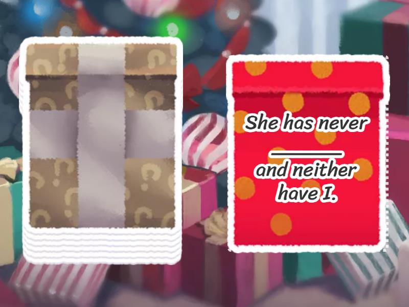 She has never _______ and neither have I., She has already ________ and so have I., She can _________ and so can I., She _________ but I do not., She ________ and so do I., She will ________ and I will too., She did not ________ and neither did I..