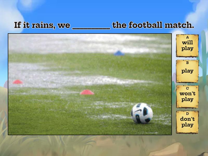 1) If it rains, we __________ the football match. a) will play b) play c) won't play d) don't play 2) If she misses the bus, she _________ a taxi. a) will take b) takes c) don't take d) won't take 3) If I ______ home tonight, I will watch a horror movie. a) stays b) stay c) will stay d) don't stay 4) You'll feel better if you _____ a pill. a) don't take b) take c) will take d) takes 5) If you switch off the lights, you________ energy a) save b) don't save c) will save d) won't save 6) You will improve your English if you ______ more. a) study b) studies c) will study d) won't study 7) If you cook fry some eggs, I _________ some coffee. a) makes b) don't c) won't make d) will make 8) If you mix blue and red ... a) you get purple b) you get hungry c) you get yellow 9) If I have coronavirus a) I will go to school b) I stay home c) I go to the beach 10) If it rains a) the cat will jump b) my mother calls me c) the grass gets wet 11) If I am hungry a) I eat something b) I get a dog c) I will talk to my friend 12) If there is an earthquake ... a) you evacuate b) you will run c) you are happy