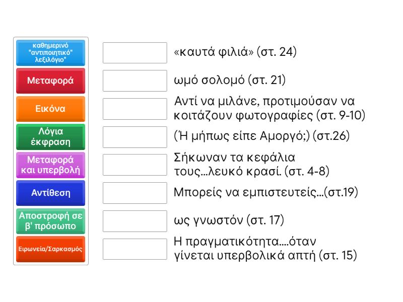 Αντίθεση - Αντί να μιλάνε, προτιμούσαν να κοιτάζουν φωτογραφίες (στ. 9-10), Μεταφορά - Η πραγματικότητα....όταν γίνεται υπερβολικά απτή (στ. 15), Λόγια έκφραση - ως γνωστόν (στ. 17), Αποστροφή σε β' πρόσωπο - Μπορείς να εμπιστευτείς...(στ.19), Ειρωνεία/Σαρκασμός  - (Ή μήπως είπε Αμοργό;) (στ.26), Μεταφορά και υπερβολή - «καυτά φιλιά» (στ. 24), Εικόνα - Σήκωναν τα κεφάλια τους...λευκό κρασί. (στ. 4-8), καθημερινό "αντιποιητικό" λεξιλόγιο" - ωμό σολομό (στ. 21),