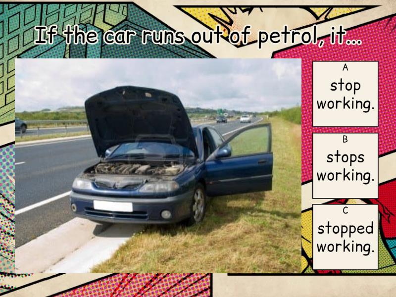 1) If the car runs out of petrol, it... a) stop working. b) stops working. c) stopped working. 2) If there is a big electrical storm, we... a) will not play football outside. b) not play football outside. c) plays football outside. 3) If you miss the bus, you... a) be late for school. b) will be late for school. c) won't are late for school. 4) If you touch the dog while it's eating, it... a) bite you. b) be bite you. c) will bite you. 5) If you feel tired,  a) go to bed early. b) goes to bed early. c) went to bed early. 6) If you are late for work again, your boss... a) get angry. b) will get angry. c) is will angry. 7) If you play the music too loud, your neighbours... a) are complain. b) will be complain. c) will complain. 8) If your cellphone runs out of battery too soon, a) buy a power bank. b) buys a power bank. c) are buy a power bank. 9) If you see smoke coming out of your car, a) stops it immediately. b) you will stops immediately. c) stop it immediately 10) If you mix yellow and blue, you... a) are getting green. b) get green. c) gets green.