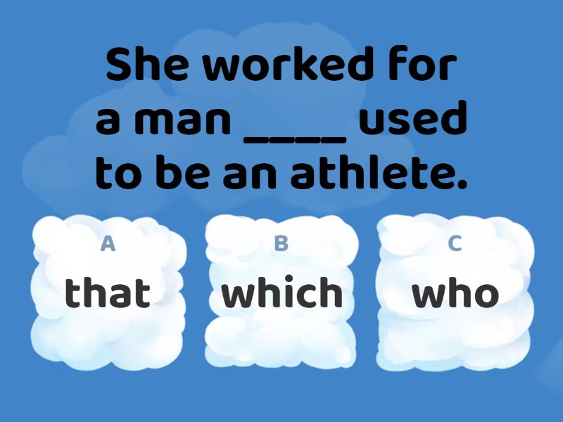 1) She worked for a man ____ used to be an athlete. a) that b) which c) who 2) We broke the computer ____ belonged to my father. a) that b) who c) which 3) The customer liked the waitress ____ was very friendly. a) who b) that c) which 4) They live in a city _____ is in the north of England a) where b) which c) that 5) The girl _____ works in the bank is from India a) that b) who c) which 6) She has a son _____ is a doctor. a) which b) that c) who 7) I live in the city ______ I study. a) which b) that c) where 8) We bought a house ____ is 200 years old. a) which b) that c) who 9) I sent a letter _____ arrived three weeks later. a) who b) that c) which 10) My boss, ____ is very nice, lives in Manchester. a) who b) which c) that 11) My sister, _____ I live with, knows a lot about cars. a) that b) which c) who 12) The bar in Barcelona _____ I met my wife is still there. a) which b) where c) that
