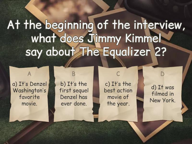 1) At the beginning of the interview, what does Jimmy Kimmel say about The Equalizer 2? a) a) It’s Denzel Washington’s favorite movie. b) b) It’s the first sequel Denzel has ever done. c) c) It’s the best action movie of the year. d) d) It was filmed in New York. 2) Why did Denzel Washington decide to do a sequel for The Equalizer 2? a) a) He needed the money. b) b) He wanted to try something new. c) c) The script was really good. d) d) The director convinced him. 3) What does Jimmy Kimmel ask Denzel about his role in The Equalizer 2? a) a) If he enjoyed filming the action scenes. b) b) If he had ever used the app Lyft in real life. c) c) If he thinks his character is like him in real life. d) d) If he would do another sequel after this one. 4) How does Denzel describe his relationship with apps? a) a) He loves using apps but only for work. b) b) He doesn’t use any apps at all and is analog. c) c) He only uses social media apps. d) d) He prefers Android over iPhone. 5) What did Denzel say when his son checked the time on his phone? a) a) "That’s a waste of time." b) b) "Use your brain instead of your phone." c) c) "You have a watch on your wrist." d) d) "Why do you even have a phone?"