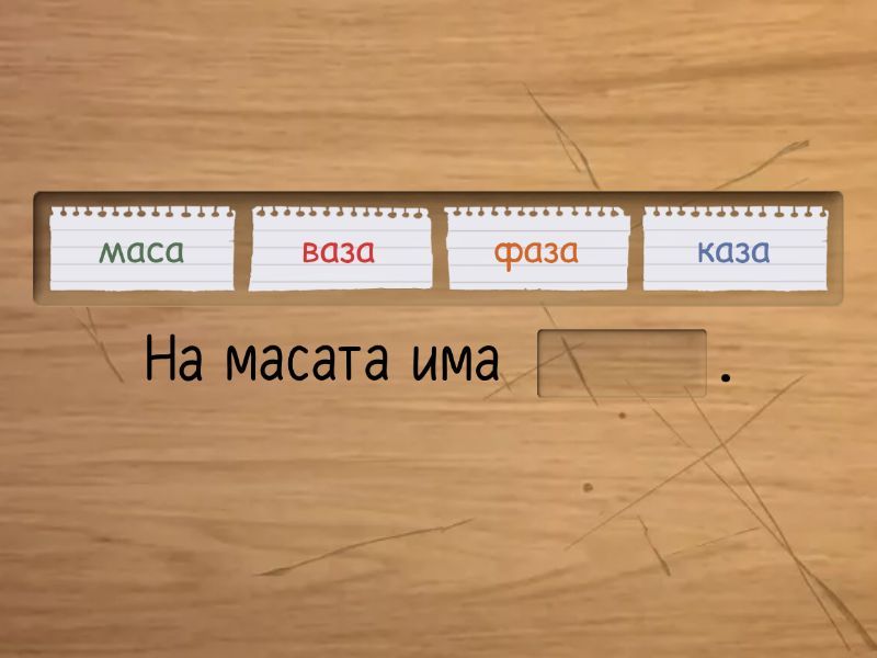 На масата има ____. ____ седна на зелената трева. Зузи ____ навън. Симо има топли ____ дрехи. Ясен отиде на ____ при дядо Стоян. Времето става ____. Симеон ____ на масата. Саша изпя ____. Христо има синя ____. Подарих ____ на Сузи.
