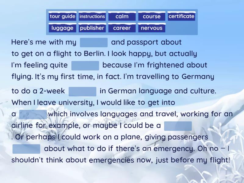 Here’s me with my ____ and passport about to get on a flight to Berlin. I look happy, but actually I’m feeling quite ____ because I’m frightened about flying. It’s my first time, in fact. I’m travelling to Germany to do a 2-week ____ in German language and culture. When I leave university, I would like to get into a ____ which involves languages and travel, working for an airline for example, or maybe I could be a ____ . Or perhaps I could work on a plane, giving passengers ____ about what to do if there’s an emergency. Oh no – I shouldn’t think about emergencies now, just before my flight! Jen: Excuse me, are you the librarian here? Luke: Yes, do you need some help? Jen: Yes, I’ve ____ for a book for the last ten minutes but I haven’t found it yet. Luke: Do you have the title of the book? Jen: No, but it ____ by Rufus Boothroyd. Luke: I don’t know that author – I ____ working here for long. What’s the book about? Jen: It’s about Australia. Luke: Oh, it ____ in the travel section then. Let’s see…No, it’s not under the letter B… Jen: Oh, here it is, in the section of authors beginning with the letter D. Luke: Oh – somebody must have ____ and put it back in the wrong place! Sorry about that! Jen: No worries. It ____ easy to check that all the books are in the right place all the time!