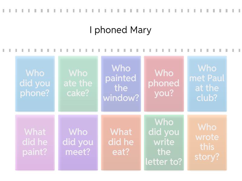 Who did you phone? - I phoned Mary, Who phoned you? - Mary phoned me, Who wrote this story? - Peter wrote it., Who did you write the letter to? - I wrote it to Kate., What did he paint? - A window, Who painted the window? - The painter., Who ate the cake? - The cat ate it., What did he eat? - A cake., Who did you meet? - I met my friends., Who met Paul at the club? - Kate and Tim met him.,