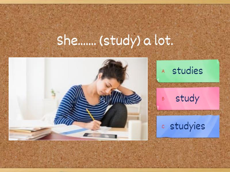 1) She....... (study) a lot. a) studies b) study c) studyies 2) My friend...... (talk) to her mother every day. a) talkes b) talk c) talks 3) My brothers .............(drive) a car . a) drives b) drive 4) My sister .......(not sing) well. a) doesn't sing b) doesn't sings c) don't sing 5) .........he........(swim) on Sundays? a) Does\ swim b) Does\ swims c) Do\ swim 6) Bob .......(not run) at the weekend. a) doesn't runs b) doesn't run c) don't run 7) My son........(cry) a lot when he is hungry. a) cryes b) cry c) cries 8) My dog.........(eat) a lot of food. a) eats b) eat c) eates 9) My students .........(read) very well in class. a) reads b) read c) reades 10) ..........my mother ........(cook) delicious? a) Do\cooks b) Does\cook c) Does\cooks 11) ......you ....(wake) up early? a) Do\ wakes b) Do\ wake c) Does\ wake 12) Does Sonia have a dog?  a) Yes, he does b) Yes, she do c) Yes, she does 13) Do you ride a bike? a) Yes,I does b) Yes,I do