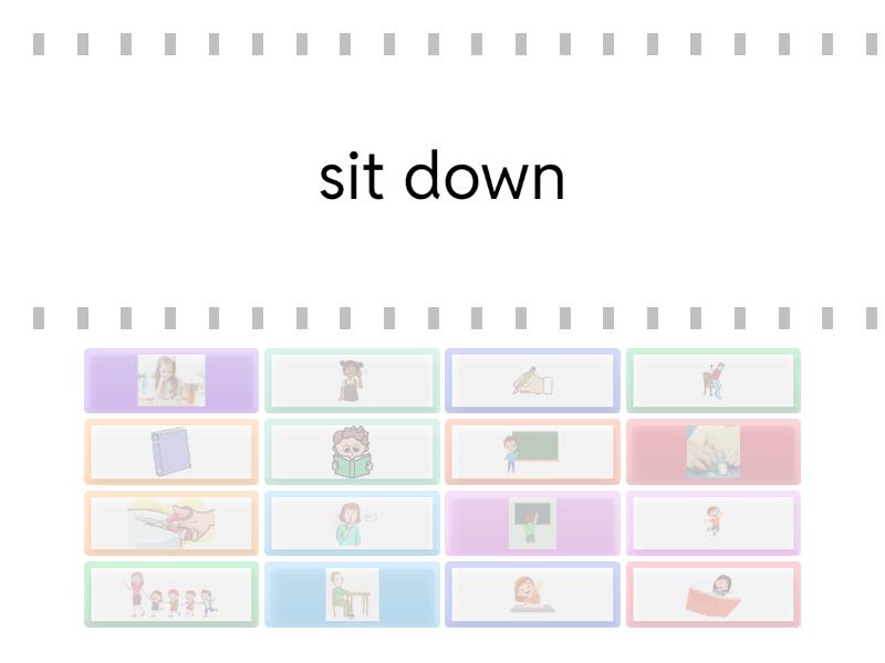 sit down , open your book , close your book, stand up, Come up to the board, raise your hand, read, look at the board, color, be quiet, paste, cut, line up, jump, write, listen,