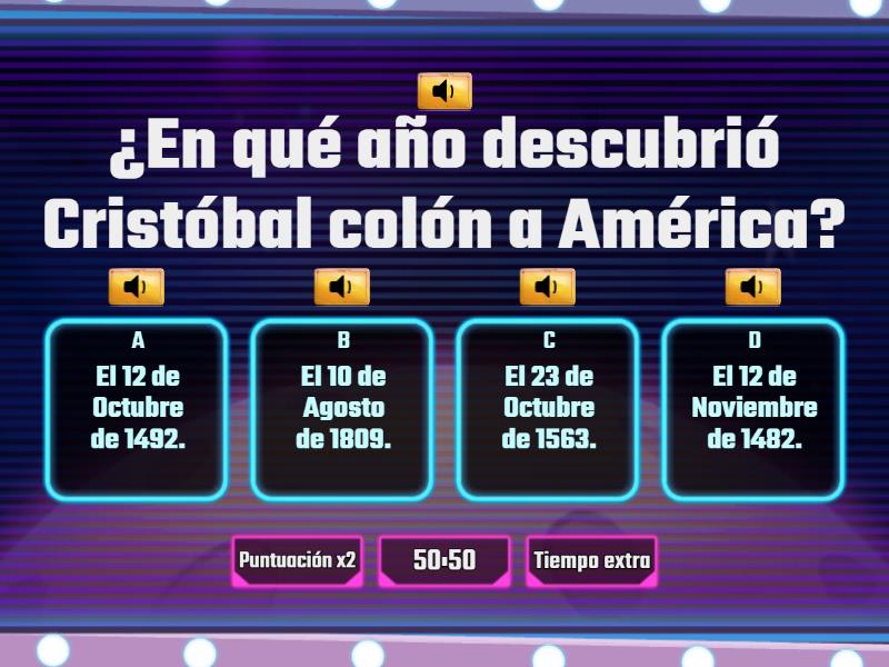 1) ¿En qué año descubrió Cristóbal colón a América? a) El 12 de Octubre de 1492. b) El 10 de Agosto de 1809. c) El 23 de Octubre de 1563. d) El 12 de Noviembre de 1482. 2) ¿Cuándo ocurrió la primera guerra mundial? a) El 15 de Junio de 1844. b) El 28 de Julio de 1914. c) El 26 de Marzo de 1945. d) El 12 de Enero de 1678. 3) ¿Cuál es el valor de '' pi'' ? a) 1,2678 b) 3,5634 c) 3,4589 d) 3,1416 4) ¿Cuáles son los elementos de una división? a) Minuendo, el sustraendo y la diferencia. b) Sumando, sumando y total. c) Dividendo, el divisor, el cociente y el residuo. d) Multiplicando, el multiplicador, el signo y el producto. 5) ¿En qué año se originó la escritura? a) Entre 65.000 y 4.000 años. b) Entre 30.000 y 6.500 años. c) Entre 56.000 y 3.000 años. d) Entre 41.000 y 10.000 años. 6) ¿Qué son los adverbios? a) Palabras que aportan información sobre el modo, lugar, tiempo, cantidad, afirmación, duda, entre otros, en que se desarrolla una acción. b) Los sustantivos son palabras con las que se designan y clasifican los seres y las entidades de la realidad o de la ficción c) Modifica siempre a un sustantivo y concuerda con dicho sustantivo en género y en número. d) Es una parte de la oración, concretamente una categoría léxica, que expresa una acción, movimiento, existencia, consecución, condición o estado del sujeto.