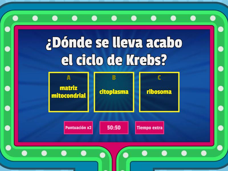1) ¿Dónde se lleva acabo el ciclo de Krebs? a) matriz mitocondrial b) citoplasma c) ribosoma 2) ¿Cuántas son las reacciones enzimáticas del ciclo del Krebs? a) 10 b) 8 c) 7 3) ¿Qué se elimina en el ciclo de la urea? a) Amoniaco b) Oxígeno c) Dióxido de carbono 4) ¿Qué produce la Glucolisis? a) ATP b) Piruvato c) NADH - FADH₂ 5) ¿Cuántos carbonos tiene el acetil-CoA? a) 8 carbonos b) 6 carbonos c) 2 carbonos 6) ¿Por qué se elimina el amoniaco en el ciclo de la urea? a) Para eliminar el nitrógeno b) Para evitar su toxicidad c) Para que el ciclo sea más corto 7) ¿ Qué enzimas están involucradas en reacciones? a) ATP - GTP b) ATP - HTI c) X - Y 8) ¿Dónde se da el proceso de la Síntesis de citrulina? a) Citosol b) Membrana celular c) Mitocondria 9) ¿En qué se convierte el succinato? a) Fumarato b) Oxalacetato c) Carbamoil 10) ¿Cuántas vueltas da el ciclo de Krebs? a) 4 b) 3 c) 2