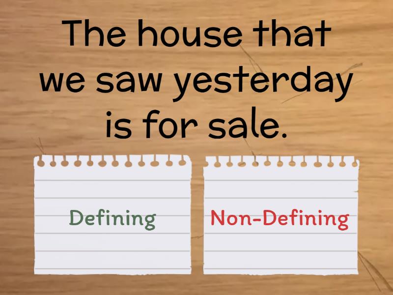 1) The house that we saw yesterday is for sale. a) Defining b) Non-Defining 2) Paris, which is known for its art and culture, attracts millions of tourists each year. a) Defining b) Non-Defining 3) The man who called me last night left a message. a) Defining b) Non-Defining 4) The book which won the award is on the shelf. a) Defining b) Non-Defining 5) My brother, who lives in New York, is coming to visit this summer. a) Defining b) Non-Defining 6) The students who studied hard passed the exam. a) Defining b) Non-Defining 7) Her car, which was a gift from her parents, is brand new. a) Defining b) Non-Defining 8) London, where the River Thames flows, is a historic city. a) Defining b) Non-Defining 9) The restaurant where we met has a great atmosphere. a) Defining b) Non-Defining 10) The teacher, who has been teaching for 20 years, is retiring next month. a) Defining b) Non-Defining