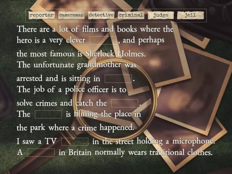 There are a lot of films and books where the hero is a very clever ____, and perhaps the most famous is Sherlock Holmes. The unfortunate grandmother was arrested and is sitting in ____. The job of a police officer is to solve crimes and catch the ____. The ____ is filming the place in the park where a crime happened. I saw a TV ____ in the street holding a microphone. A ____ in Britain normally wears traditional clothes. The newspaper ____ said “Diamond Thief Escapes from Jail!” The ____ in the newspaper described the whole robbery in detail. The reporter did a live ____ with a woman who saw the robbery. A very expensive ____ was stolen from the museum last night. The criminal received a very serious ____ from the judge. The ____ said the article had a clue that could help solve the case.