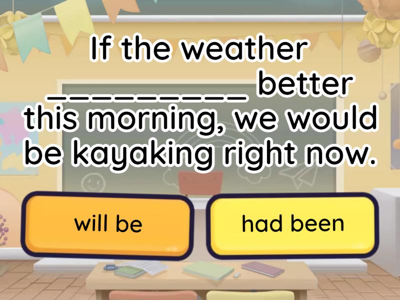 1) If the weather _________ better this morning, we would be kayaking right now. a) will be b) had been 2) If I _________ been sleeping, I would have heard the doorbell ring. a) have b) hadn’t 3) You wouldn’t have missed the bus if you _________ paying attention to the announcements. a) had been b) been 4) If the tour I took last year had ___________ in Rome, I wouldn’t be going there now. a) stopped b) would 5) I would be __________ in Italy if I spoke Italian a) work b) working 6) You wouldn't be smiling if you __________ the truth. a) known b) knew 7) If I were rich, I wouldn't __________ in this job. a) worked b) be working 8) If I were in Paris, I __________ drinking an espresso in a café right now. a) would be b) had been 9) I don’t know what we would have done if they hadn't been __________ reservations. a) accepting b) accept 10) If she hadn't __________ homework, she would have been drinking with her friends.  a) been doing b) be doing