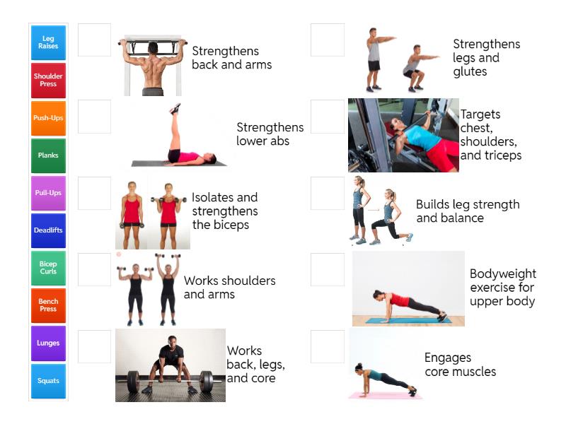 Squats - Strengthens legs and glutes, Deadlifts - Works back, legs, and core, Bench Press - Targets chest, shoulders, and triceps, Lunges - Builds leg strength and balance, Push-Ups - Bodyweight exercise for upper body, Pull-Ups - Strengthens back and arms, Planks - Engages core muscles, Shoulder Press - Works shoulders and arms, Bicep Curls - Isolates and strengthens the biceps, Leg Raises - Strengthens lower abs,
