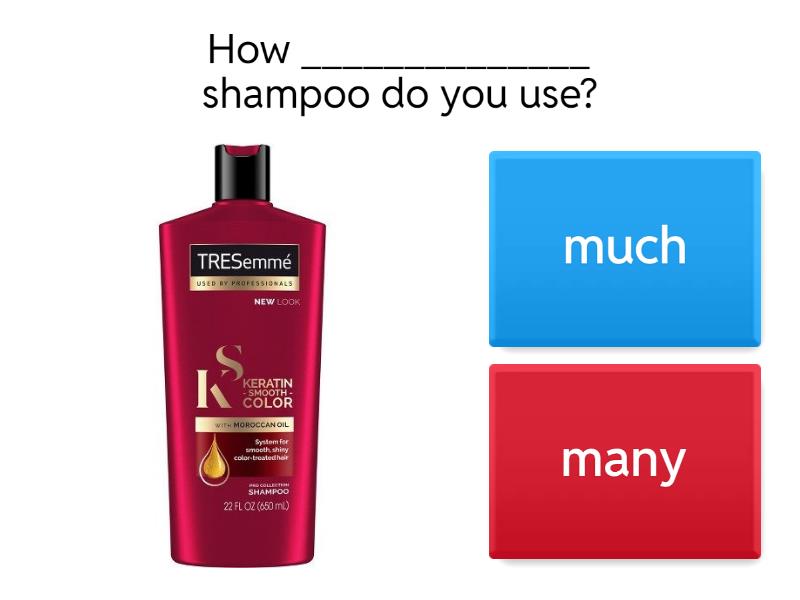1) How ______________ shampoo do you use? a) much b) many 2) I bought __________ nail clippers. a) much b) many 3) She doesn't have ________ nail files! a) any b) some 4) We have ____________ dental floss. We don't need to buy more. a) a lot of b) any 5) I have __________ hair gel in the bathroom. a) any b) some 6) The drugstore doesn't have __________ sunscreen a) A lot of b) much c) many 7) She doesn't have ___________ razors. a) Many b) lots of c) Much