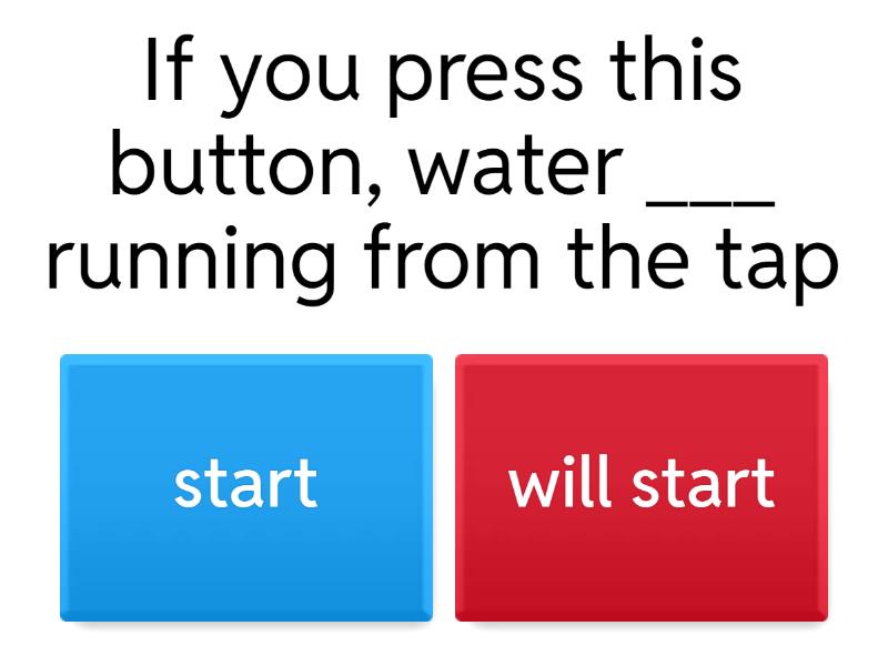1) If you press this button, water ___ running from the tap a) start b) will start 2) If Susan has time, she ............ her emails a) check  b) will check 3) If people ___ too much, they often feel sick a) eat b) will eat 4) If it isn't sunny tomorrow, ____ go to the beach a) we don't  b) we won't 5) If this project ____ I will get a better mark a) goes well b) will go well