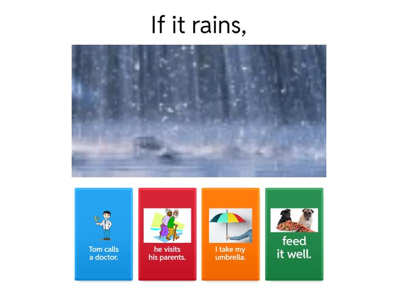 1) If it rains, a) Tom calls a doctor. b) he visits his parents. c) I take my umbrella. d) feed it well. 2) If you eat well, a) take your umbrella. b) you feel well. c) feed it well. d) tell them there is some pasta. 3) If Stella gets sick, a) Tom calls a doctor. b) I get scared. c) it boils. d) tell him I’m fine. 4) If it becomes dark, a) I get scared. b) tell them there is some pasta. c) take your umbrella. d) he visits his parents. 5) If the temperature is 100ºC, a) he visits his parents. b) feed it well. c) tell them there is some pasta. d) water boils. 6) If Jack goes on holiday, a) take your umbrella. b) Tom calls a doctor. c) he visits his parents. d) it boils. 7) If you have a big dog, a) you spend a lot on food. b) tell them there is some pasta. c) he visits his parents. d) I get scared. 8) If Ann, Sam and Bill are hungry, a) I get scared. b) take your umbrella. c) they always cook some pasta. d) Tom calls a doctor.